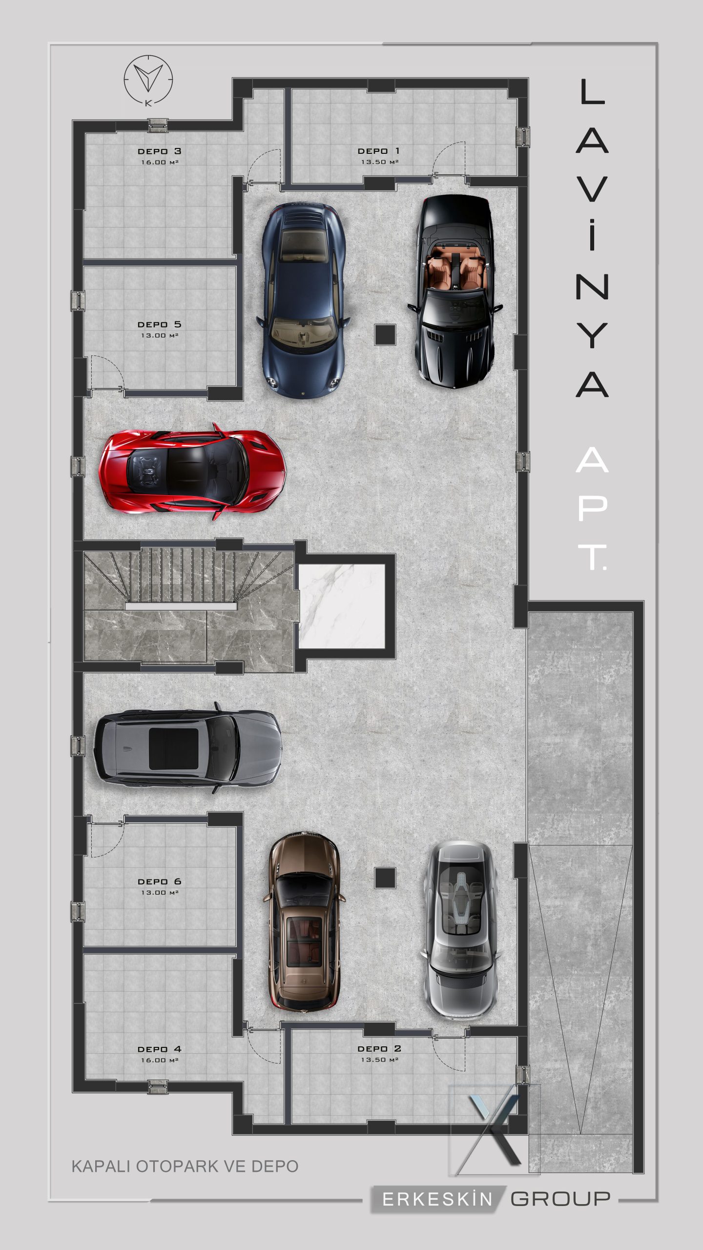 Bodrum katımıza 5 metrelik otomatik panjur sistemi ile rahat giriş ve manevra alanı sağlanmıştır. Her dairenin 1 adet otopark ve depo alanı mevcuttur.