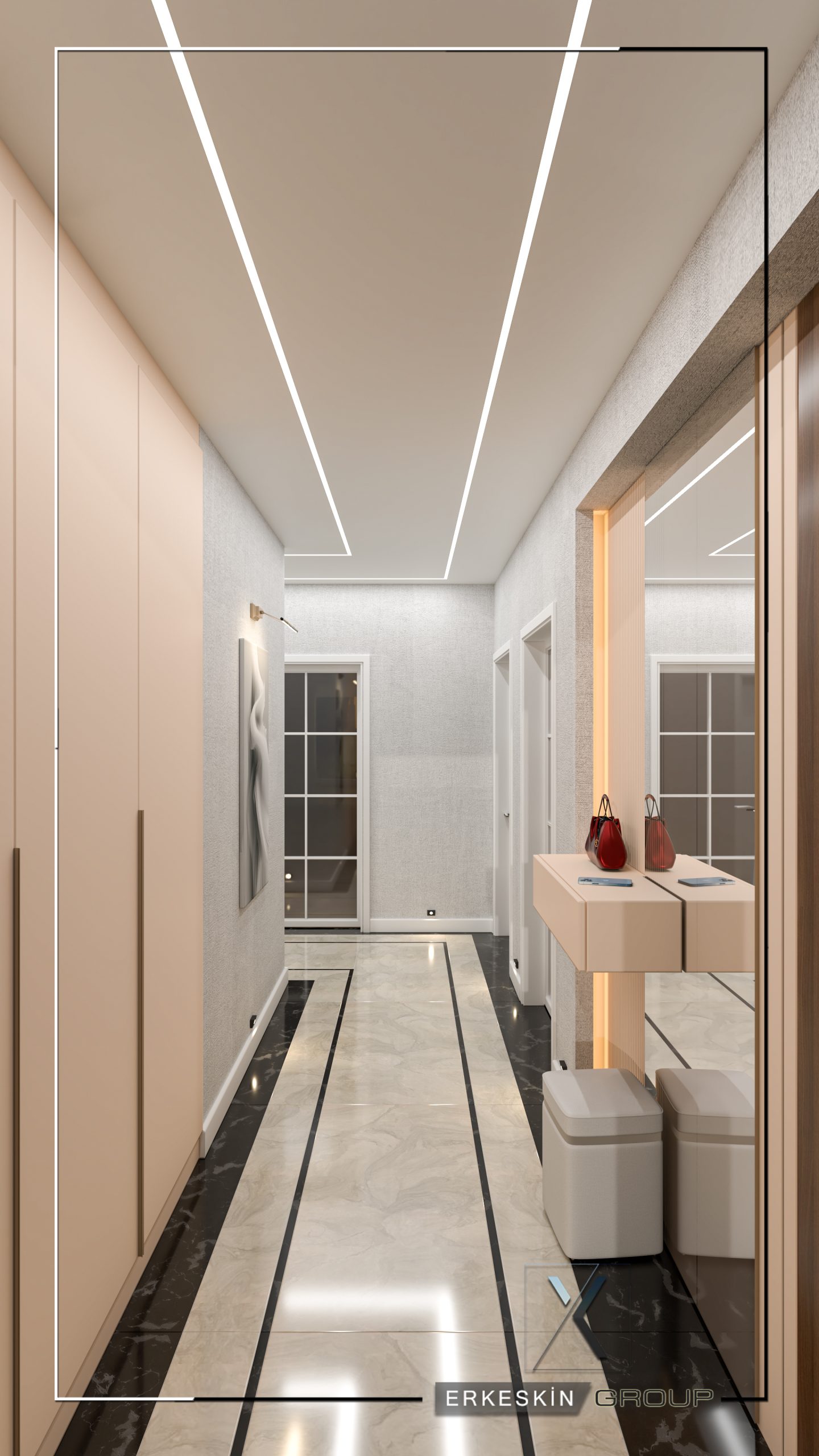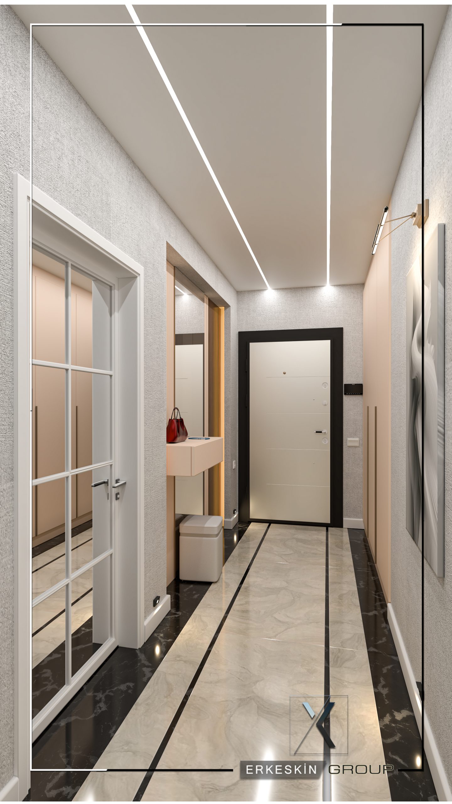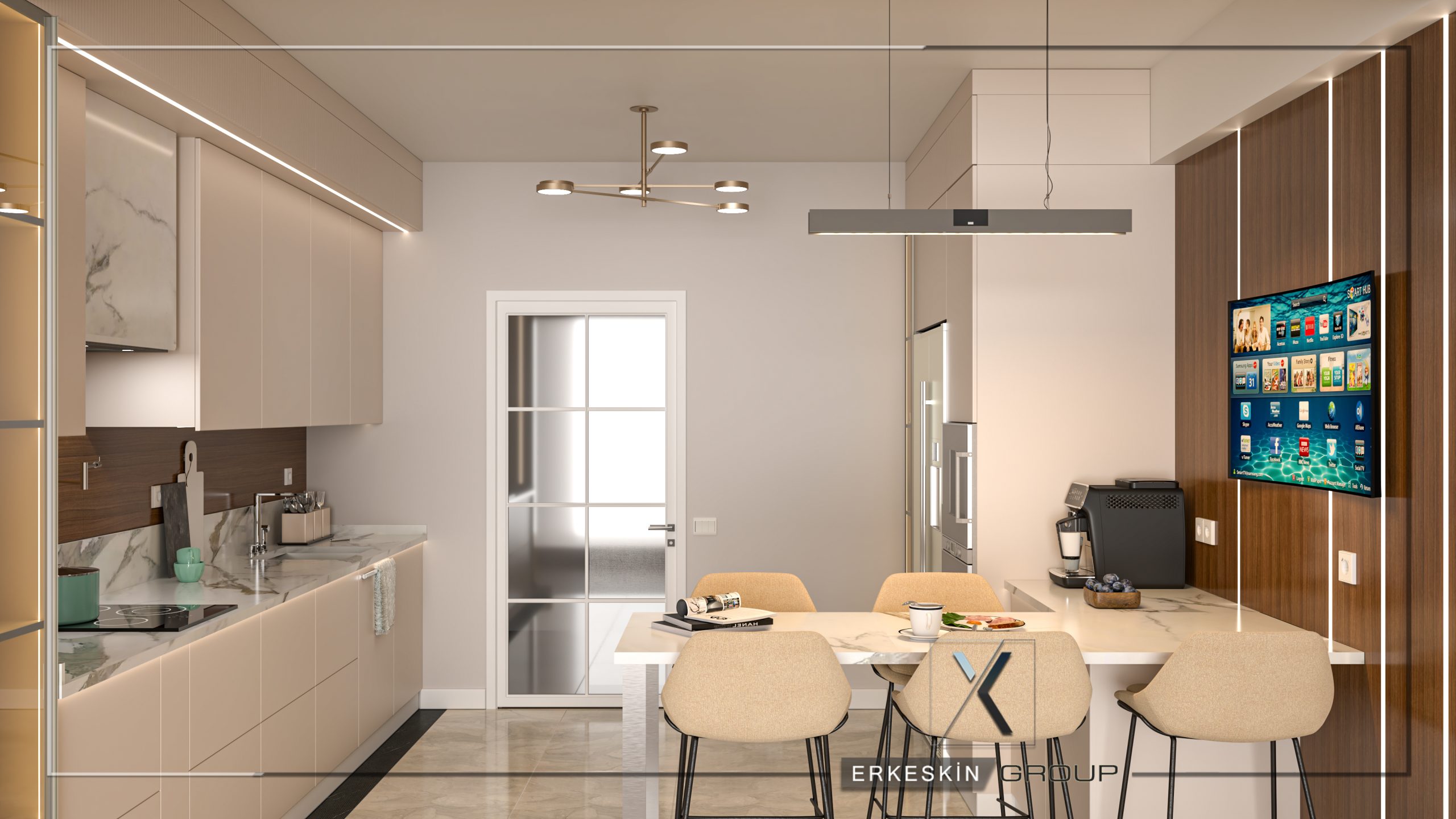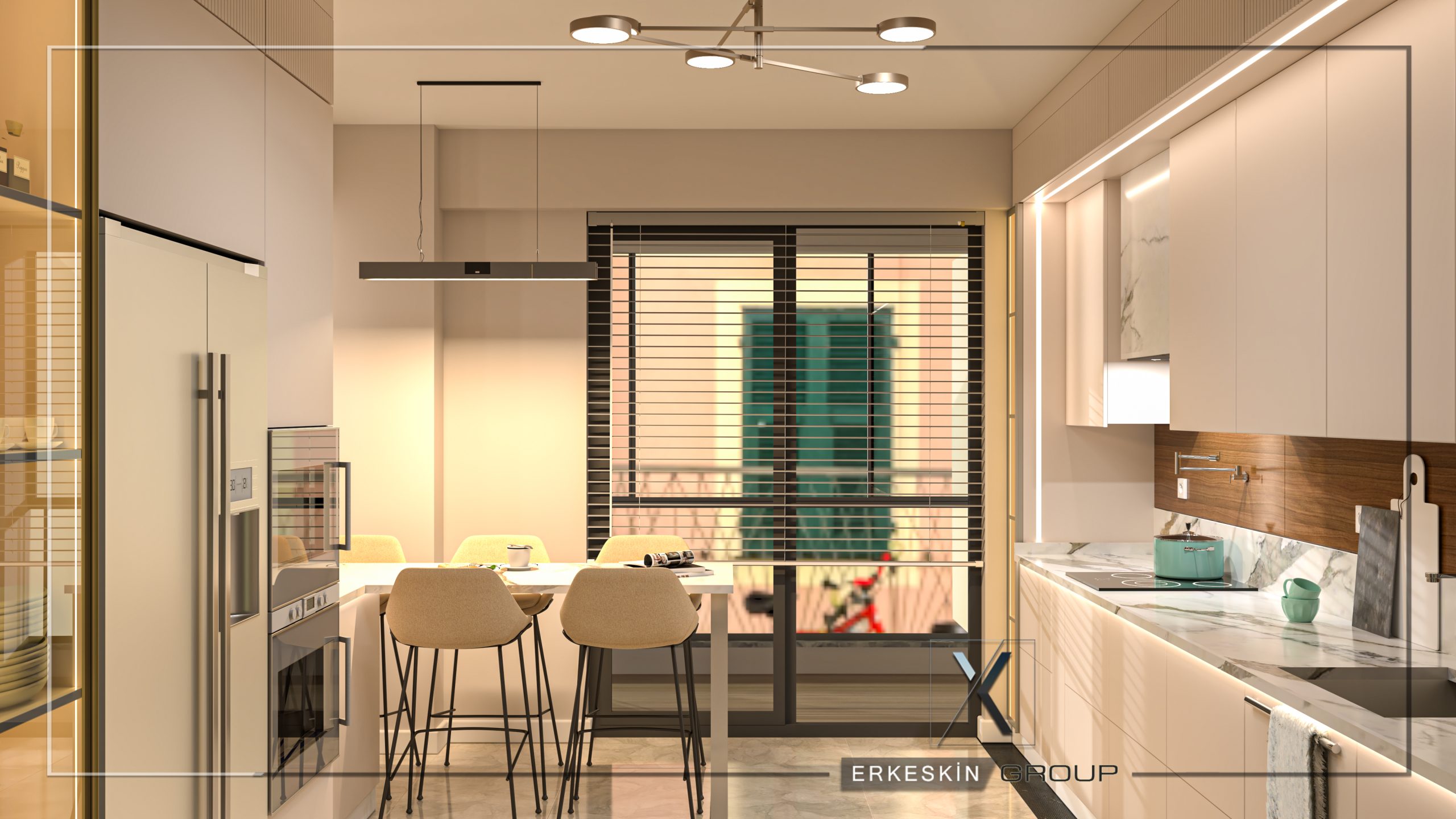 Dairenin ihtiyaçlarını karşılayacak iç mekan ürünleri tasarlanacaktır. Mutfakta aventos sistem kapaklar, yağlık, gizli kaşıklık, çift tezgah, ankastre set ve çift kapaklı buz dolabı için alan vb. detaylar kullanım kolaylığı düşünülerek tasarlanmıştır. Tüm dolaplar mekanik sistemdir. Koridorda gömme vestiyer ve dresuar alanı tasarlanmıştır. Islak hacimlerde; banyo dolapları, masajlı duş kolon sistemleri(Vitra), klozet(serel) ve bataryalar(ECA) 1. sınıf marka ürünler kullanılacak. Cam balkonu sürgülü ve çift ısıcam ile yapılacak. Dairenin tüm pencereleri Egepen Legend serisi ile yapılmış olup gizli panjurlar ile tasarımı desteklenecektir. Audio marka görüntülü diafon sistemi kullanılacak. Apartmana şifre ve kart okuma ile giriş yapılmaktadır. Daire kapılarına sesli komut, şifre, telefon ve kumanda üzerinden erişim sağlanmaktadır. Zeminlerde yeni sezon Kütahya granit, mermer, Çamsan parke kullanılacaktır. Tüm iç zeminlerde alttan ısıtma panelleri kullanılacak. Her mekan iç mimari konsept ile tasarlanacaktır.